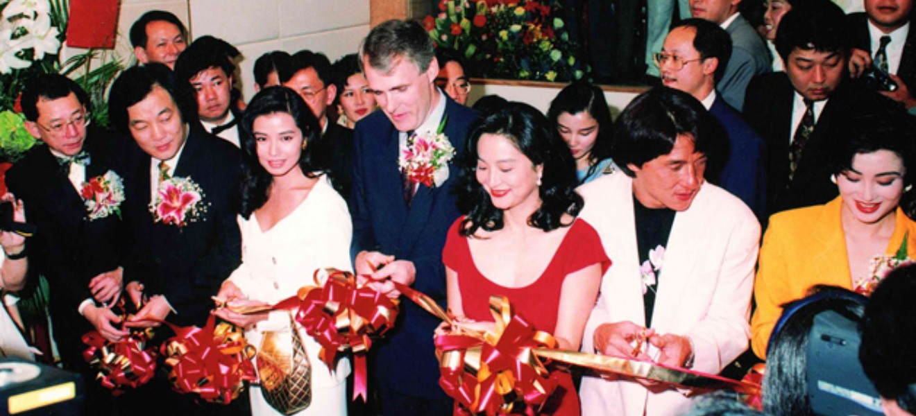 英皇钟表珠宝中环分行开幕,巨星成龙博士、钟楚红、林青霞、张敏及当时的汇丰银行总经理艾尔敦等主持剪彩仪式。